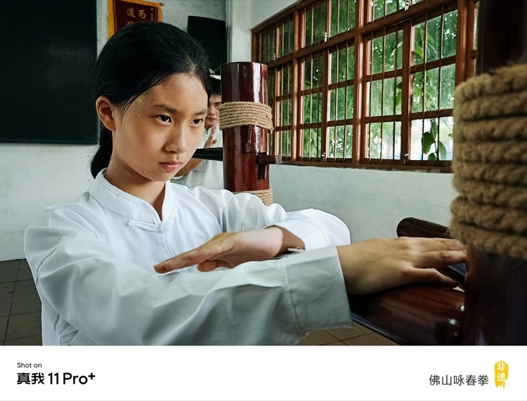 佛山作为国家级历史文化名城,以及岭南广府文化发源地和兴盛地,拥有多项国家级乃至世界级的非物质文化遗产。跟随王冰冰探索非遗的脚步,首先领略到的就是逾百年历史的佛山咏春拳。在真我11 Pro+行业首创的2亿单镜变焦相机的记录下,王冰冰跟着掌门学起了咏春拳的基本功“小念头”,依托于行业最高2亿像素旗舰传感器——三星HP3超级变焦版,她的一招一式都被清晰捕捉。同时,真我11 Pro+还是首款搭载4倍无损单镜变焦技术的手机,因此就连正在练功的小徒弟额头上的每一颗汗珠都清晰可见。