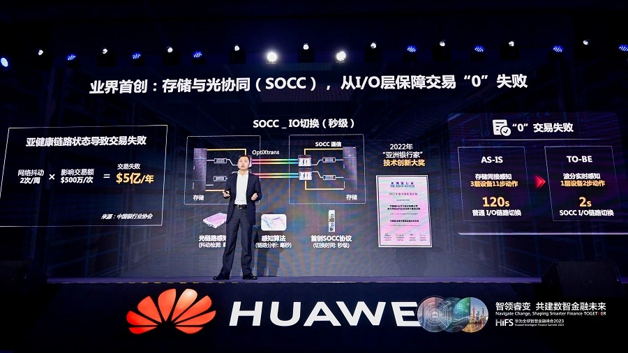 华为光产品线副总裁金志国详细介绍了基于F5G技术的金融智简全光网解决方案,通过SOCC存储和光协同、5ms极速倒换、同缆检测等创新技术,保证交易高可靠;通过硬管道等创新技术,保证金融全光园区数据传输零风险。