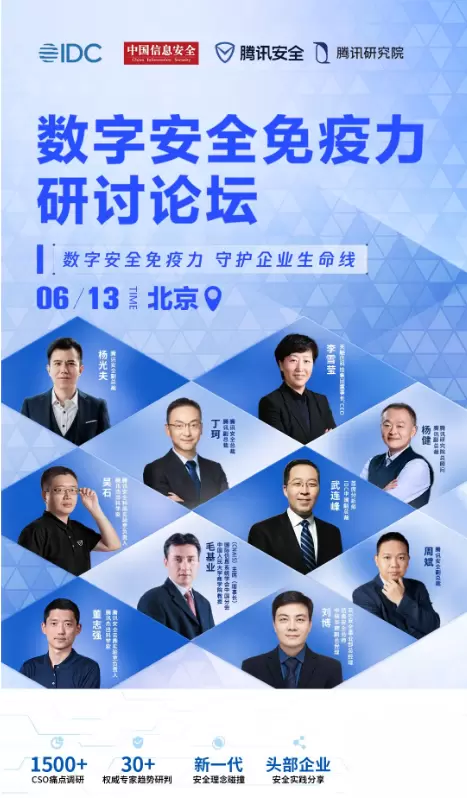 6月13日,腾讯安全、腾讯研究院将联动IDC、《中国信息安全》杂志社、CIO时代、新基建创新研究院等多家行业机构、媒体共同发起「数字安全免疫力」研讨论坛,汇聚产学研各界专家,研判安全态势、分享最佳实践,碰撞新一代的安全理念,用数字安全建设范式创新,为千行百业的企业发展提供助力。