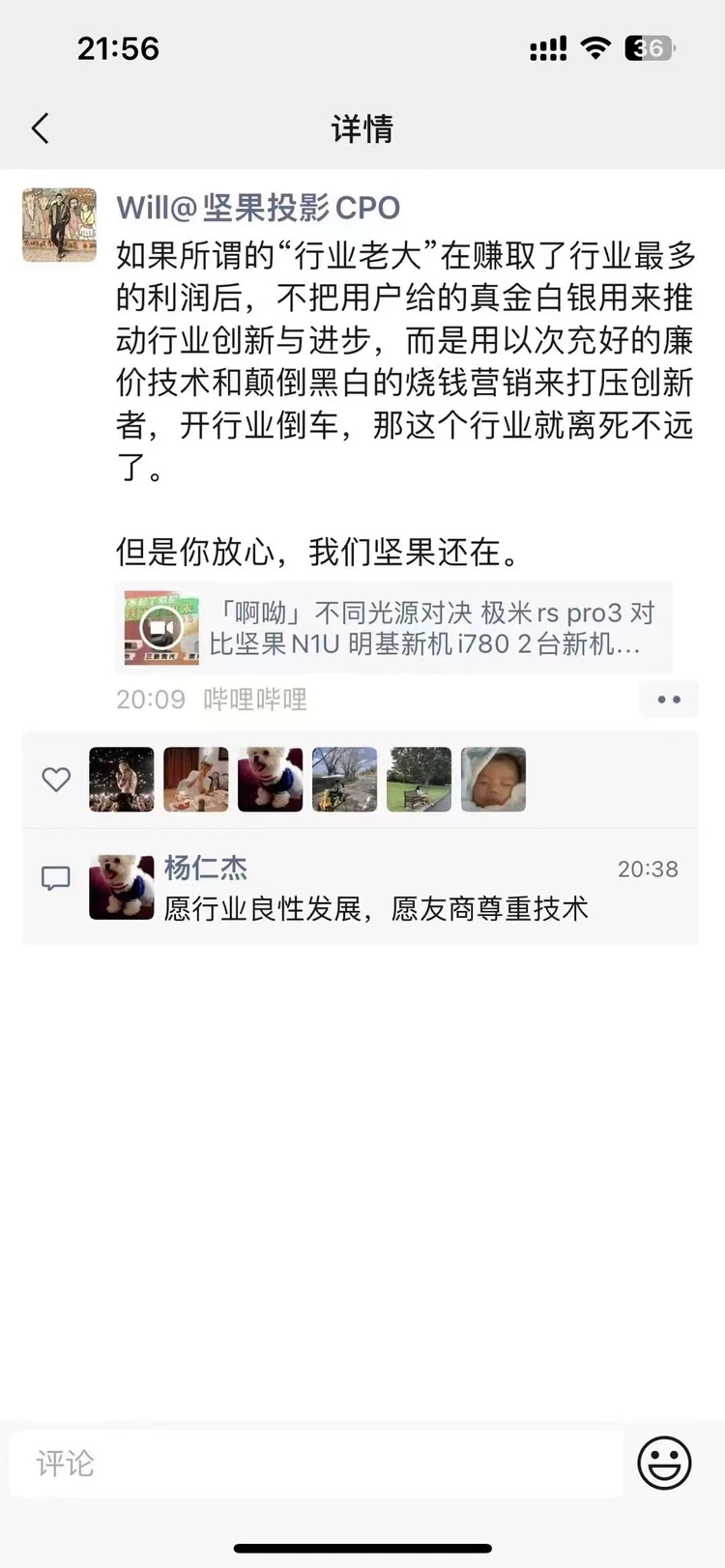 5月28日晚,此视频引起坚果投影首席产品官王骁逸的关注并在社媒点名友商打压创新,随后极米公关负责人通过社交媒体回应,从而引发行业热议。