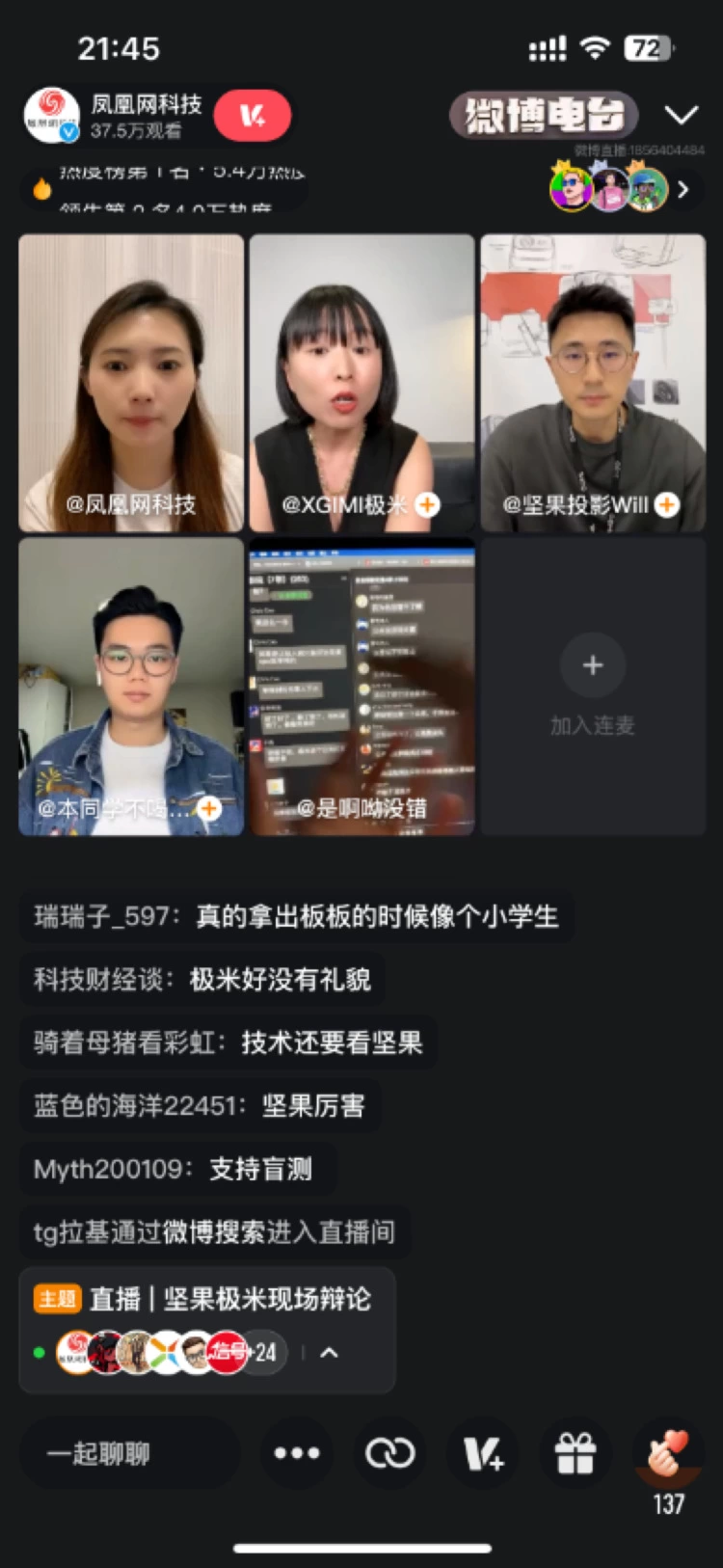 5月29日,凤凰网科技举办直播连线,两家家用投影品牌进行了深度对谈。整场讨论围绕着三色激光和“超级混光”哪个才是更强的投影光源技术展开。该场直播登上当晚小时段微博直播热度榜榜首,共吸引51万人实时观看,200多名数码大V参与讨论。有数码大V表示:“厂商互相抨击顶多也是口水战,没想到两大厂商高管亲自对线,精彩程度堪比老罗王自如优酷对战。”