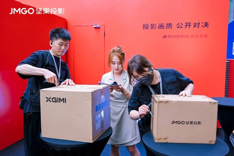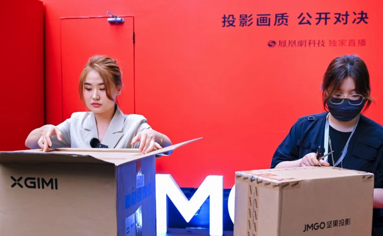 6月8日,深圳主会场参与盲测的两台机器完全由凤凰网科技统一通过京东平台直接采购并带到活动现场,在众多媒体和用户的见证下首次开封。测试环境为临时搭建的暗室,投影画面墙壁为普通的乳胶漆墙面,以此来最大程度模拟用户日常观影的真实环境。