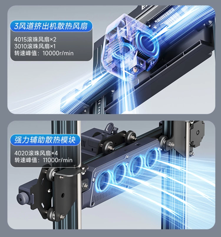 海王星4在满足高性能的同时,还采用智能飓风散热系统,该系统搭载 7 个高转速滚珠风扇,风量大幅提升,快速打印时可极速全面散热,减短散热路径,整机散热能力飙升,有效降低堵塞风险。机器在打印完成后,当喷头温度低于 50℃,喷头散热风扇会自动停止工作,降低能耗。