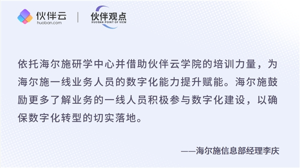 此外,直播中李庆还向观众重点分享了海尔施如何依托海尔施研学中心并借助伙伴云学院的培训力量为一线业务人员的数字化能力提升赋能。海尔施鼓励更多了解业务的一线人员积极参与数字化建设,以确保数字化转型的切实落地与成效。