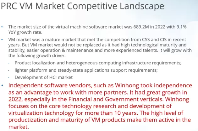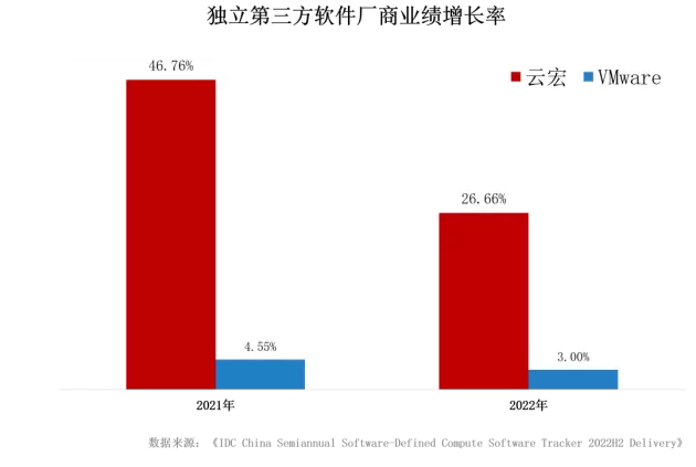 报告特别指出,云宏作为独立软件供应商,10余年来持续专注虚拟化核心技术研发,产品具有高度产品化和成熟度等特点,同时凭借独立第三方优势和更广泛的硬件、软件的适配性,在2022年业绩增速明显,尤其是在金融、政府等垂直领域成为更多选择。由此可见,云宏作为报告中唯一对标国外厂商VMware的国产软件企业,依托自身多年技术积累,增速明显。云宏连续两年虚拟化市场业绩增速第一,总体来看,在软件定义计算领域中国力量优势凸显。