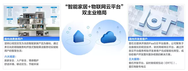 萤石网络是科创板智能家居上市企业,杭州亚运会官方指定智居物联服务企业。以云平台为基础,萤石网络发展了“智能家居+物联网云平台”的双主业,是行业内少有的从硬件设计研发制造到物联云平台,具备完整垂直一体化服务能力的AIoT 企业。