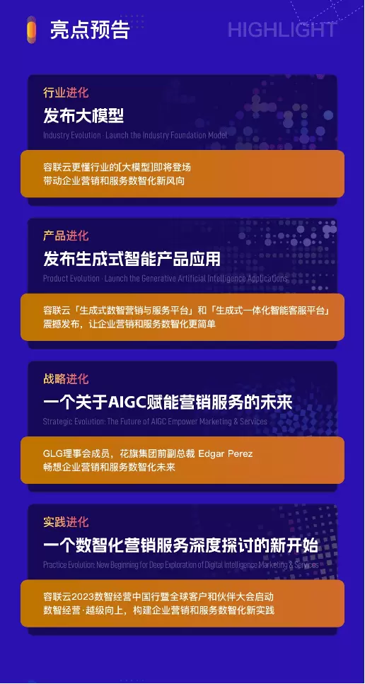 容联云多年磨利剑,持续深耕通讯+AI,基于银行、证券、保险、汽车、零售等多行业背后的数智化转型沉淀,容联云行业服务场景大模型即将登场,同时发布多款生成式AI产品,核心AI研究及产品团队将带来TO B大模型商业路径的相关探讨。同时论坛将重点围绕大模型、生成式营销与服务、AIGC商业化演进趋势等话题展开讨论,充分展现大模型赋能各行各业的多元生态,与大家共享思想盛宴。