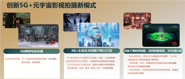 在影视拍摄环节,咪咕通过5G 即时电影拍摄技术,可实现即时摄影、瞬时导播和实时投屏,带来观看体验的升级。通过 XR+全息技术与5G和数字化手段的结合,可增强表演沉浸感与真实感,实现“数字+现实+艺术”的跨界相融。
