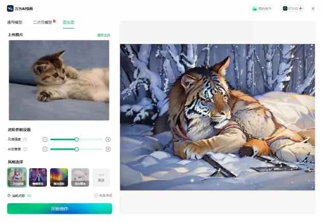 在描述框内输入“关键词”描述,选择图片尺寸,清晰度,选择图片风格,点击【开始创作】,几秒即可生成精美图片(图片的归属权为用户所有,可以免费商用哦~)。