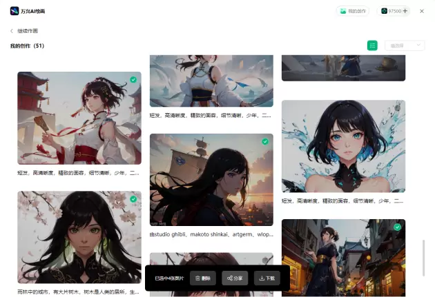 点击【我的画廊】,即可查看AI绘画作品集,用户可以对作品进行批量的操作,包括删除、分享和下载等。如果在创作过程中有自己满意的作品,点击【分享】按钮,链接将自动复制到剪贴板,然后可以通过微信等社交媒体分享给朋友。