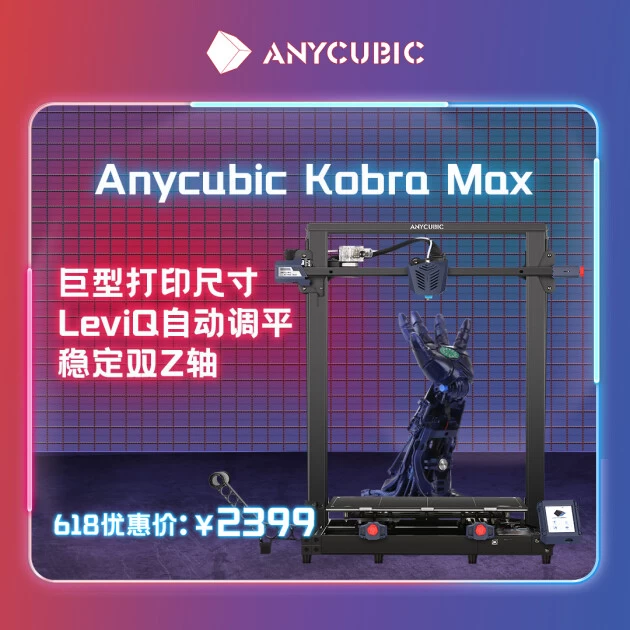 正在寻找大尺寸FDM 3D打印的小伙伴,不妨看看这款广受好评的爆款产品Kobra Max!400*400*450毫米的巨型打印尺寸,可一次性打印约2个16寸汽车轮毂大小的模型,减少分部件打印的繁琐,提升模型一次成型的效率。搭载的Anycubic LeviQ自动调平系统避免了手动调平的繁琐和不稳定,双螺纹Z轴则减少了打印晃动、保障打印质量。