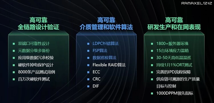 具体包括高可靠的全链路设计(如双端口设计、元数据多级备份设计、应用级数据校验等)、高可靠介质管理和软件算法(如领先的LDPC、FSP、数据巡检算法等)、高可靠研发测试及生产环节(如1800+服务器的研发测试环境、极限高低温的温巡、持续1个月的ORT测试、百万次级的异常掉电测试等),保障用户数据在全链路传输和存储过程中的安全。