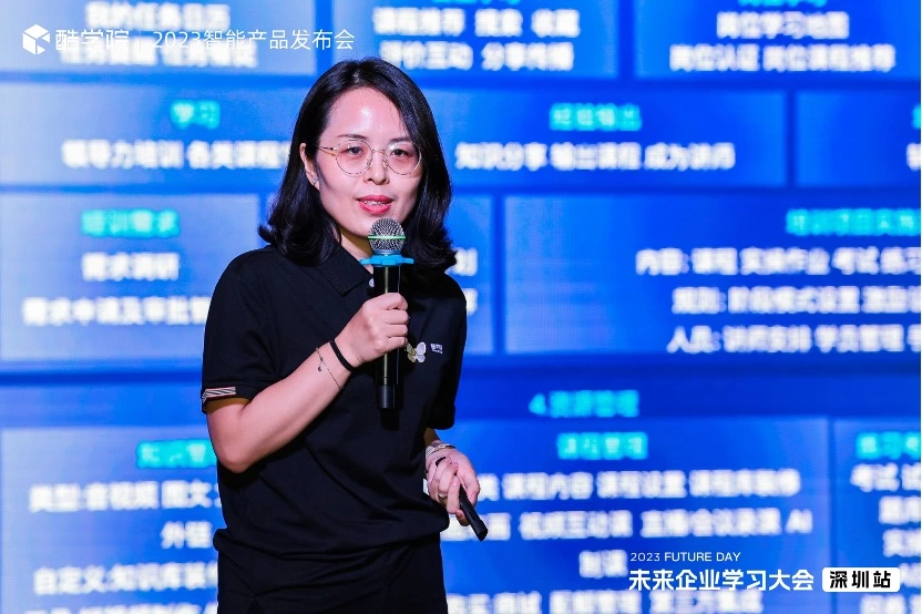 当天活动的最大亮点,无疑是酷学院的智能产品发布。此次新品发布聚焦于中大型企业的培训学习场景创新和智能化升级。酷渲科技联合创始人兼CEO孙小雨携酷学院产品团队重点展示了权限管理、自定义报表、AI学习助手等产品,以及直播、群学习等功能升级。这些创新和升级,不仅解决了集团化员工权限管理复杂的问题,也解决了中大型企业报表自定义需求高的痛点,大幅提升学习培训的体验和管理效率,更为中大型企业提供了全新的学习场景。