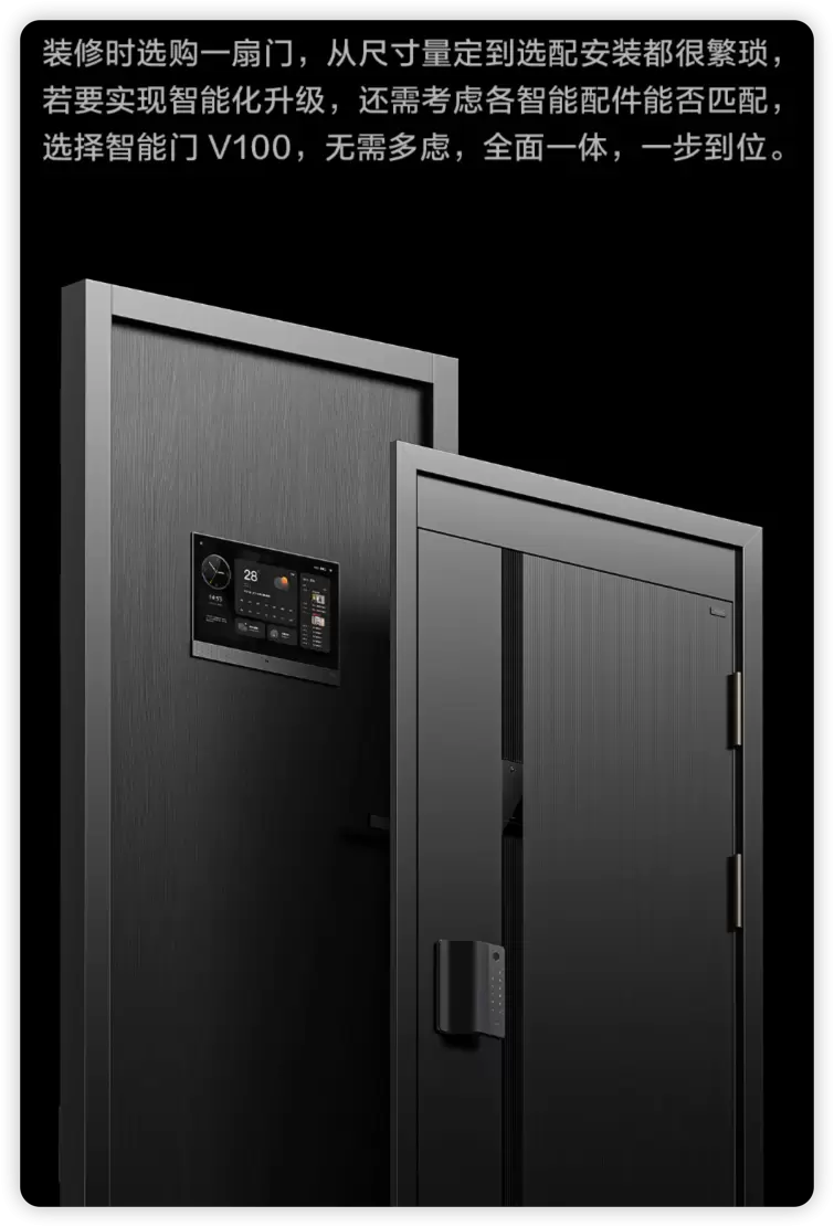 6月15日,智能家居独角兽企业Aqara推出了旗下首款智能门——Aqara 智能门 V100。Aqara 智能门 V100集智能猫眼、智能门锁、妙控屏一体设计,你家的入户门一站式解决方案,支持全尺寸定制,多色搭配。