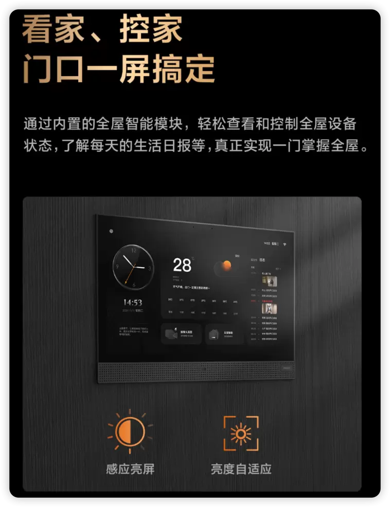 Aqara 智能门 V100配备一块 15.6 英寸的全屋妙控屏,可以轻松查看和控制全屋设备状态,了解每天的生活日报等,实现一门掌控全屋。