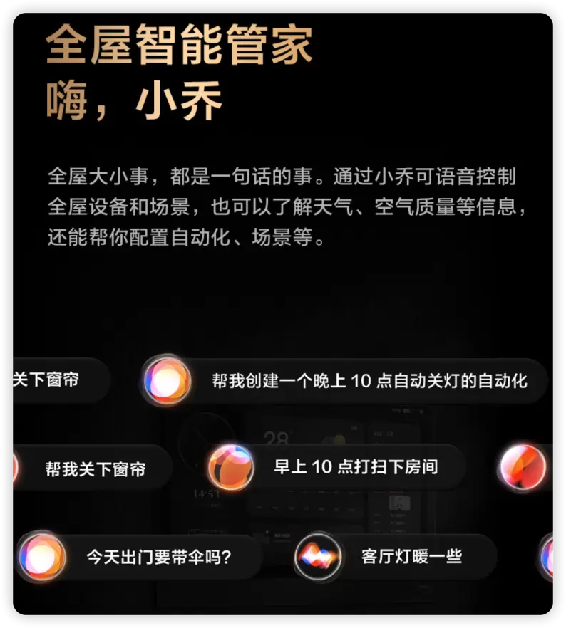 通过小乔可语音控制全屋设备和场景,也可以了解天气、空气质量等信息,还能自动帮你配置自动化、场景等。