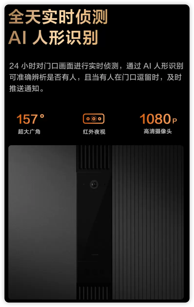 24小时对门口画面进行实时侦测,通过AI 人形识别可准确辨析是否有人,且当有人在门口逗留时,及时推送通知。