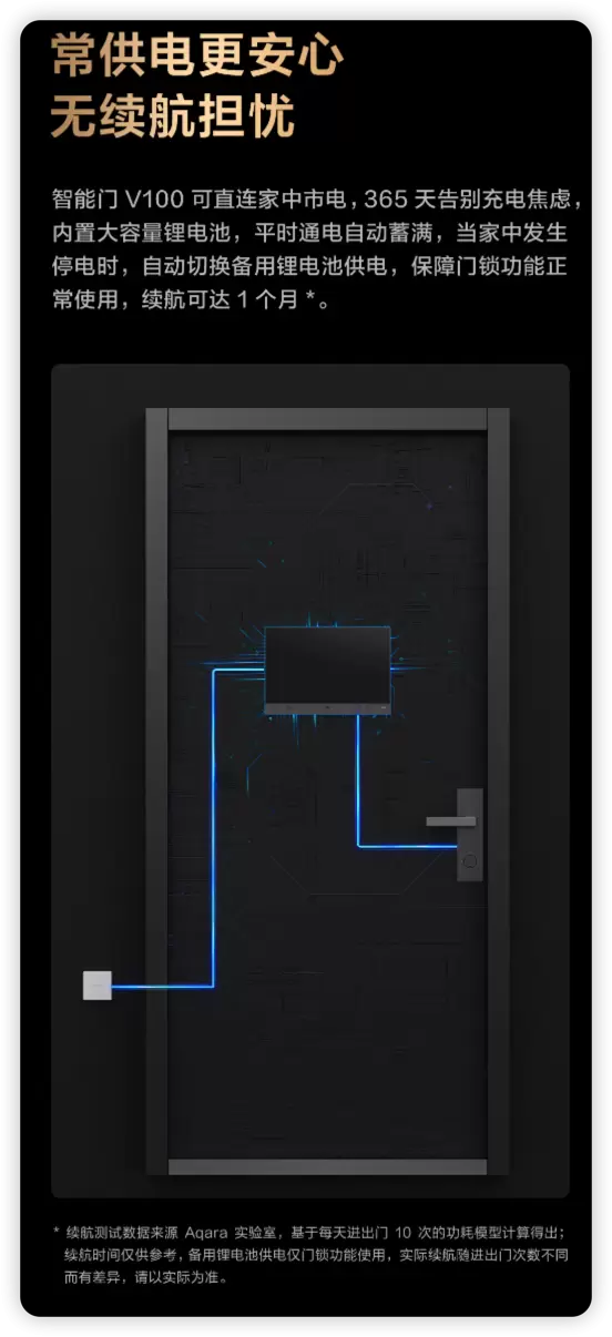 Aqara 智能门 V100可直连家中市电,365天告别充电焦虑,内置大容量锂电池,平时通电自动蓄满,家中发生停电时,自动切换备用锂电池供电,保障门锁功能正常使用,续航可达1个月。
