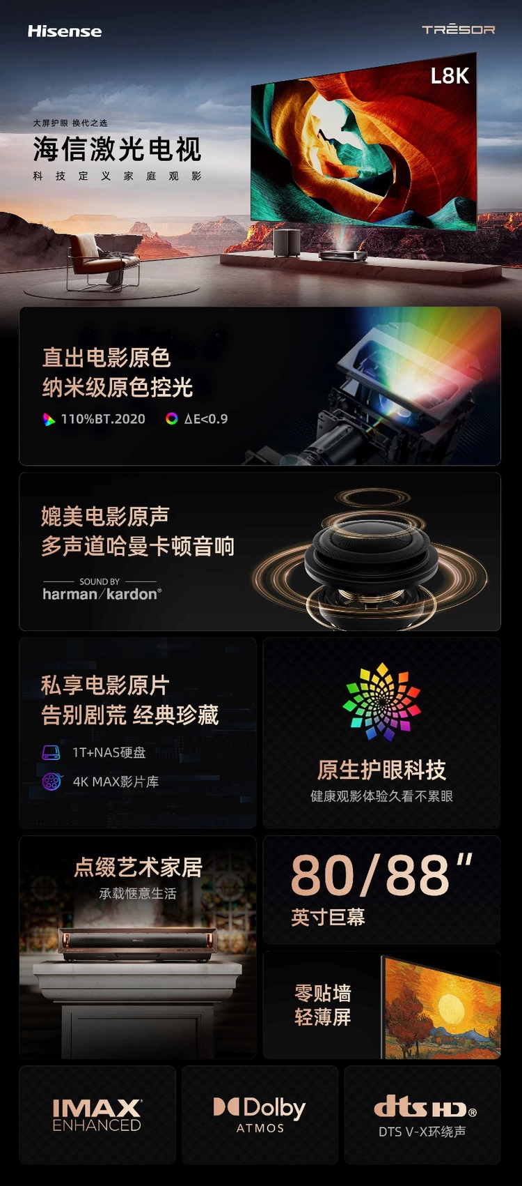 海信激光电视L8K集电影原色、电影原声、电影原片、健康护眼、家居融合五大特质于一体,是海信针对影音爱好者需求,精心打造的旗舰新品,以科技定义家庭观影。目前,80、88英寸已于全国上市,欢迎广大用户前往线下门店体验、选购。