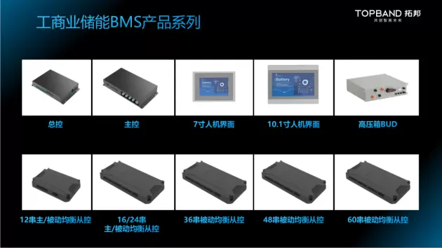 工商业储能BMS: 拓邦工商业储能BMS系统主要由总控单元(BAU) 、主控单元(BCU) 、从控单元(BMU)以及相应的线束组成。