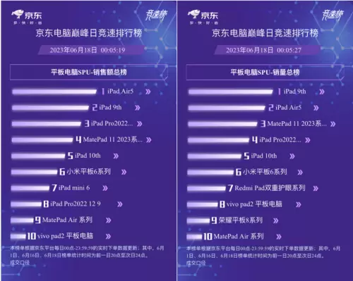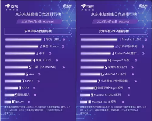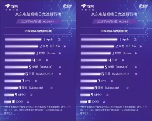 每年618也是购买平板电脑的好时机。根据京东平板电脑竞速排行榜显示,Apple、华为、联想凭借优秀的性能,受到了消费者的喜欢,成功占据了平板电脑销售额总榜、销售额自营前三位置,小米、荣耀表现强劲拿下了榜单第四、第五位,三星、vivo、微软、OPPO、iQOO占据榜单第六位至第十位。