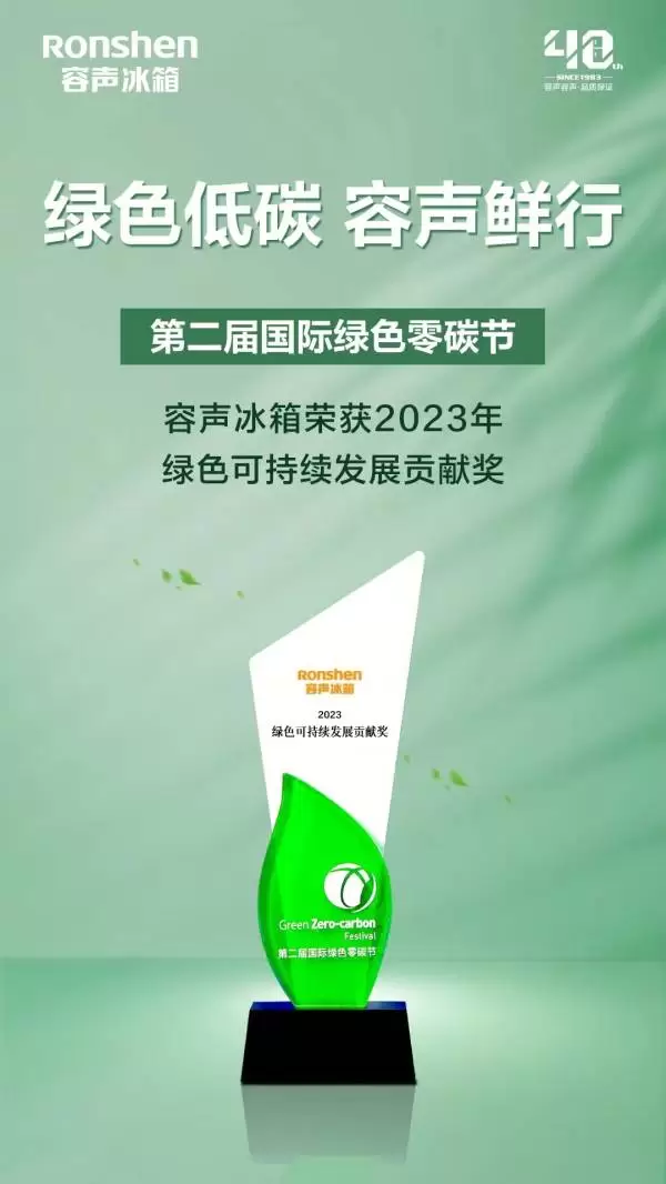在国家“双碳”战略指引下,低碳、环保已成为企业日常运作的必选项。6月15日,2023国际绿色零碳节暨2023 ESG领袖峰会在北京举行,容声冰箱凭借在低碳环保领域的卓越表现,荣获“2023绿色可持续发展贡献奖”。这既彰显了容声在产品研发和绿色节能方面的实力,也体现了其积极承担社会责任的担当精神。
