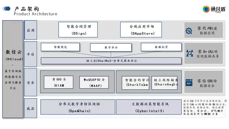 数信云4.0基于通付盾多年打造的分布式数字身份区块链(OpenChain)及大数据决策智能(CyberIntelli)引擎,升级后的数信云4.0为开发者带来三大全新数字化安全解决方案: