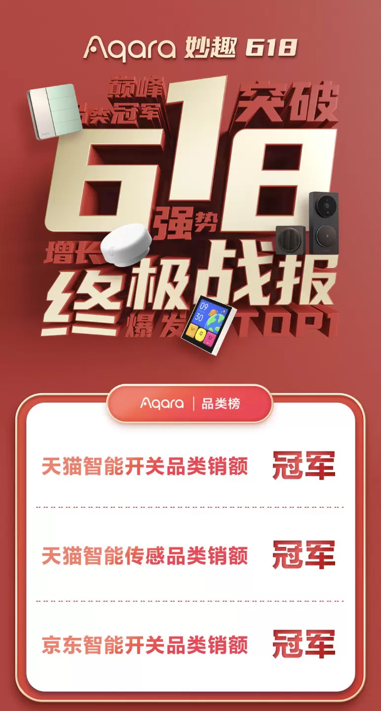 Aqara 618战报出炉,两大品类斩获全网销量销额双冠军