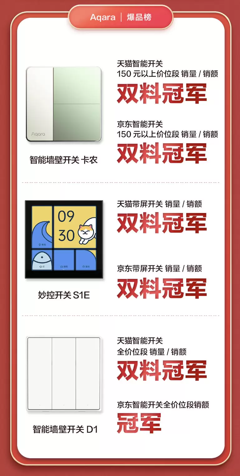 智能灯具品类销额同比增长142%,智能场景套装销额同比增长117%,其中智能墙壁开关卡农、妙控开关S1E、智能墙壁开关D1更以瞩目成绩强劲霸榜爆品王,斩获全网销量销额双料冠军!