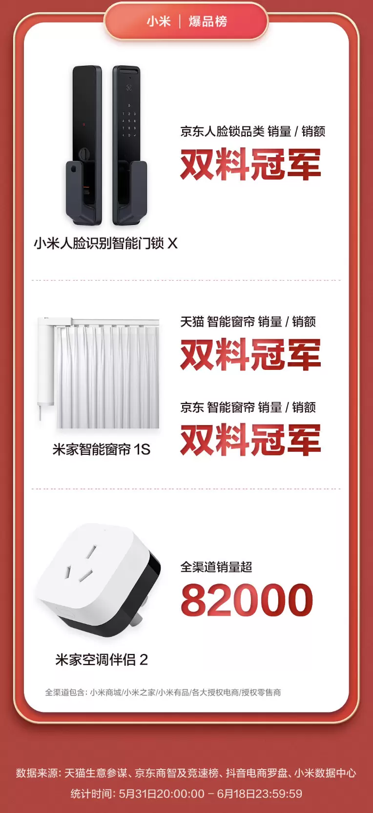 此外由绿米联创研发生产的小米人脸识别智能门锁X、米家智能窗帘1S、米家空调伴侣2再次凭借优秀的性价比获得大众追捧,登上了爆品榜。其中小米人脸识别智能门锁X获京东人脸锁品类销量销额双料冠军、米家智能窗帘1S获天猫、京东智能窗帘销量销额双料冠军,米家空调伴侣2全渠道销量超82000,绿米联创不仅为小米带来了完整的 IoT 智能产品矩阵,更是为小米618助力,用傲人的成绩完美收官。