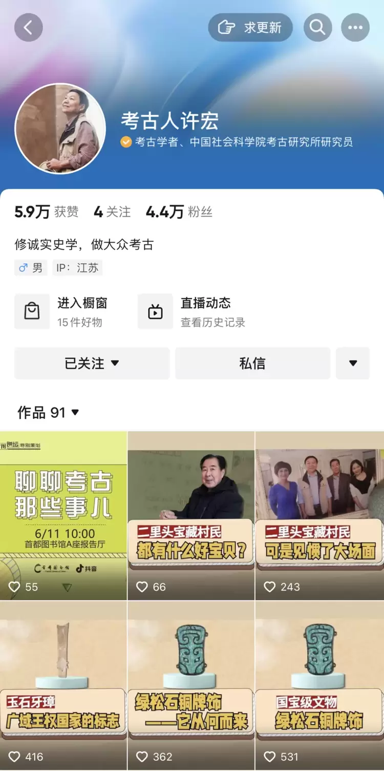 2022年,许宏入驻抖音。在抖音,他分享考古历程,科普考古知识,也将考古学这门“小众”学科带到大众眼前。对于许宏来说,抖音是他与公众交流的渠道,而对于考古一类“小众”学科来说,抖音是让“冷”知识“热”起来的窗口。