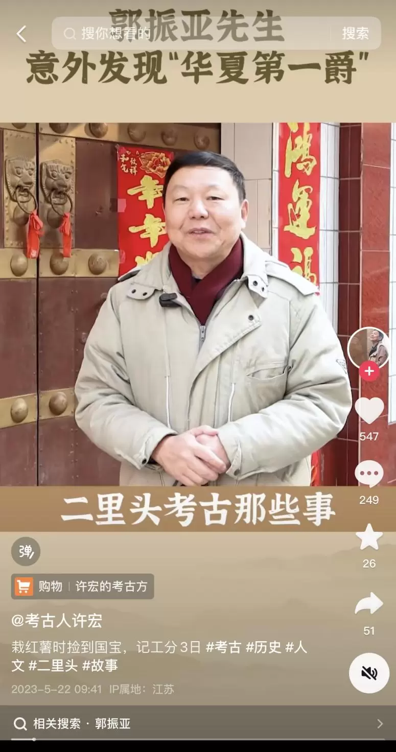 这些考古经历都被许宏记录在短视频中。许宏探望二里头遗址上的当地村民郭振亚,听郭大叔讲述如何在栽红薯时意外挖出第一件青铜爵;追忆发现绿松石龙形器时,郭大叔牵了自家的狼狗镇守宝物。