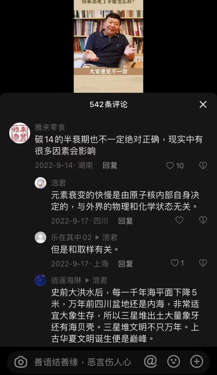 例如,“碳14测年”是一种根据碳14的衰变程度计算文物大概年代的测年方法。有人向许宏提问:如果碳14测年与考古学年代比对,结果矛盾了怎么办?许宏在相关视频中坦承:“这个问题问到了学科的软肋。”他表示,碳14测出的是绝对年代数据,考古学根据文化分期推断出的是相对年代数据。而“绝对年代不绝对”,需要整合各类要素综合判断。而评论区中,就有网友询问如何确认二里头遗址年代居于夏王朝晚期,而不是中期或早期。在这条评论之下,网友们根据许宏提出的观点,开始讨论碳14测年和文献考证的区别。“考古学的思辨之美,也显现在这个平台的互动中。”许宏说。