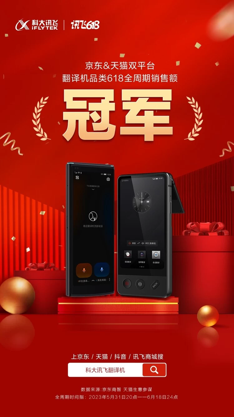 讯飞翻译机系列获得京东和天猫双平台翻译机品类连续7年销售额冠军: