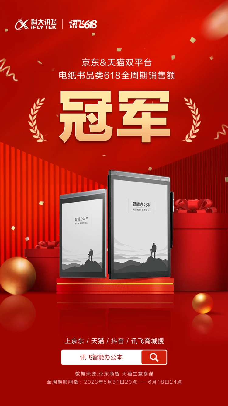 讯飞智能办公本系列获得京东和天猫双平台电纸书品类连续2年品牌销售额冠军: