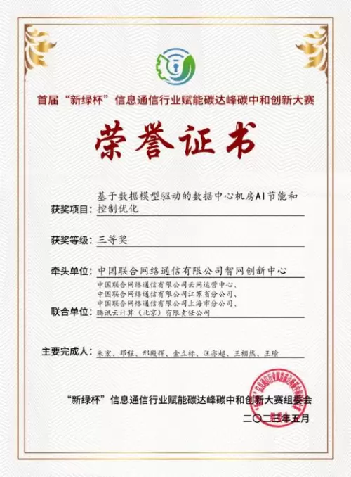 近日,以“赋能千行百业 开创绿色未来”为主题的首届“新绿杯”信息通信行业赋能碳达峰碳中和创新大赛落下帷幕,中国联通智网创新中心凭借过硬的技术实力和创新的产品实践,联合腾讯云共同打造的“基于数据模型驱动的数据中心机房AI节能和控制优化案例”在2500+参赛项目中脱颖而出,经组委会专家评定,名列前八十,荣获大赛三等奖。