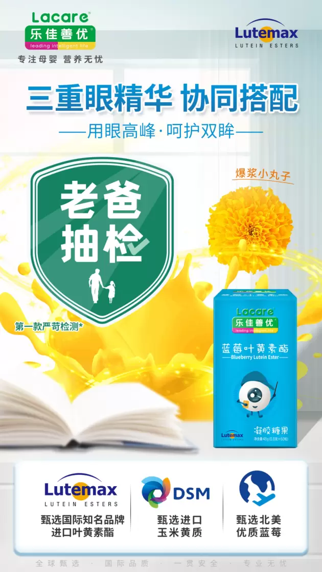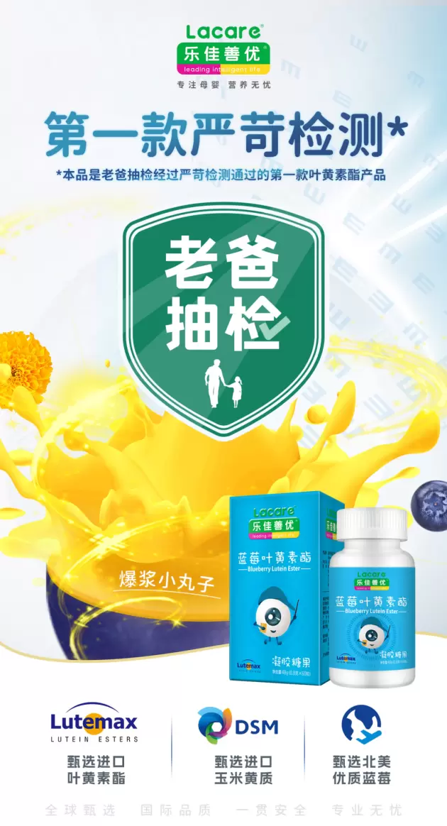 乐佳善优蓝莓叶黄素酯也是首款通过老爸评测抽检授权的叶黄素产品,不会像传统叶黄素含片那样需要配水送服,给人像是在吃药的感觉,容易忘记服用。乐佳善优蓝莓叶黄素酯小小一颗可以随时补充,而且爆浆口感,不论是小朋友还是成人,都能享受美味和营养的平衡,“嚼着吃的叶黄素酯”将掀起护眼新风潮。