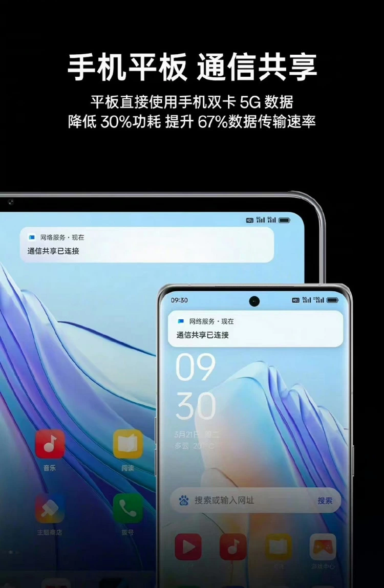 双5G通信共享中的「双」,能够实现双卡双路双5G,让主副卡通信动态切换,一张卡在通话状态下也不会影响另一张卡的数据流量使用,副卡来电也可以在平板接听,避免了漏接电话、短信的情况发生。此外,平板还能共享手机的定向流量。值得一提的是,这些功能在未来也同样适用于6G网络,全面提升用户使用网络通信的稳定性和体验舒适度。