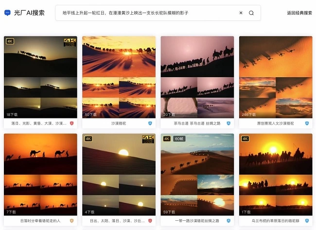 而在「光厂AI搜索」下,用户可以直接描述想要的画面,提供尽量多的信息和需求,「光厂AI搜索」便可以理解用户的需求,并匹配对应的视频素材。经典搜索与AI搜索强强结合,用户能更精准地定位自己想要的素材,进一步提升创作效率。