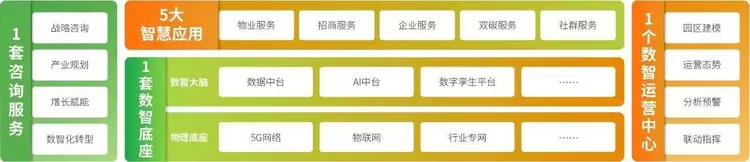 1套数智底座——提供5G网络、物联网等技术支持,助力园区实现广泛联接,夯实“物理底座”;依托大数据、AI、数字孪生等产品和服务,为园区构建“数智大脑”,赋能上层应用。