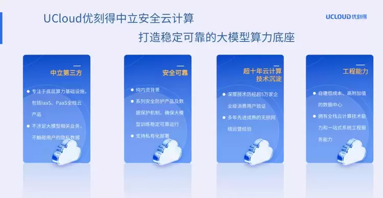 作为中立第三方,优刻得专注于底层的算力基础设施,不涉足大模型相关业务,在数据隐私、安全可信、商业机密保护等方面具备优势,满足大模型企业对模型安全的需求,已获得众多AI用户的信赖。