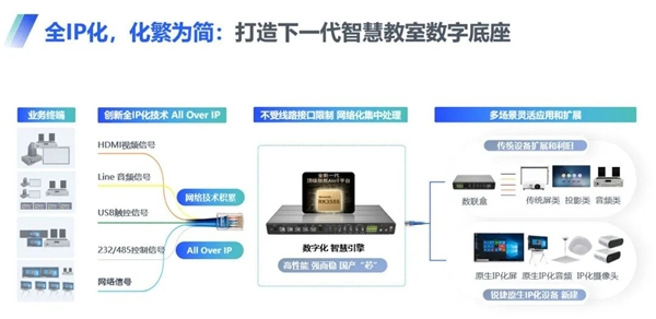 全IP化智慧教室解决方案的核心是用智慧引擎打造数字化底座,并搭配全IP化智慧教学交互系统,实现多种场景的教学创新。该方案实现了标准统一、灵活扩展和融合兼容,使得未来的智慧教室可以在建设上实现灵活扩展和应用。同时,该方案在应用上满足多场景需求,可以实现低成本常态化创新,提高教育资源利用率并满足教学需求。在管理方面,技术赋能智能评价,实现一体化管控。全IP化方案满足越来越多的多媒体教室、阶梯教室、直播教室、研讨教室的需求,未来可以通过统一标准的建设和简化部署布线、降低施工成本、减少设备故障和简化运维难度等方面,使得智慧教育普及化程度更高,推动学校进一步发展并提升教育质量和水平。