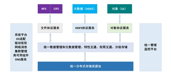 凭借统一的特性架构和操作接口,实现特性级互通,对外提供统一的增值特性服务,如统一配额、统一QoS、统一分级存储、统一回收站、统一元数据检索。设置后,对NFS、CIFS、S3、HDFS等多种协议即时同步生效。