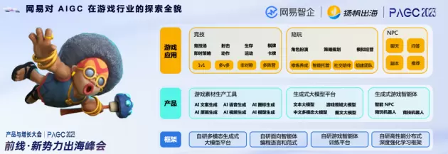 尹竞成在会上以 AI 与游戏的发展历程为引,为观众展开了网易对 AIGC 在游戏行业探索的完整图景。首先是底层框架。网易自研了多模态生成式大模型平台、面向智能体编程语言和范式、游戏智能体训练平台、高性能分布式深度强化学习框架。这些基础 AI 平台,作为工业链的基石平台,把新兴的 AI 技术转变为稳健的基础设施,帮助团队降低学习成本,提升训练效率,快速落地 AI 相关技术。基于底层框架,网易开发了不同方向的产品,其中最关键的就是生成式的游戏 AI,即游戏智能体。它们被广泛用于各种游戏产品中,承担竞技、陪玩和 NPC 这三个关键角色。