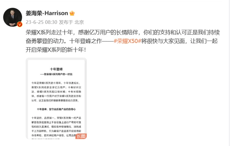 十年登峰之作,荣耀X50定档7月5日发布,荣耀姜海荣发文感谢用户十年陪伴