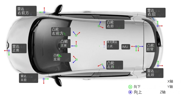 (图注:安装在 NuScenes 数据集采集车上的传感器放置位置图。它配备了6个摄像头、1个激光雷达和5个毫米波雷达。)