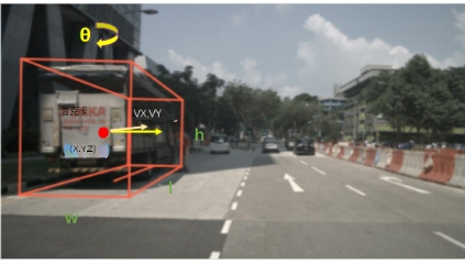 (图注:3D 目标检测图。 3D目标定义为一个盒子,(x,y,z)为盒子的中心坐标,(l,w,h)为长宽高,θ为航向角。 Class 是 3D 目标的类别。 Vx 和 vy 描述了地面上 3D 目标沿 x 和 y 轴的速度。)
