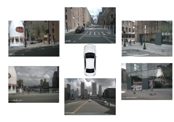 (图注:NuScenes 数据集中六个摄像头采集的图像示意图。)