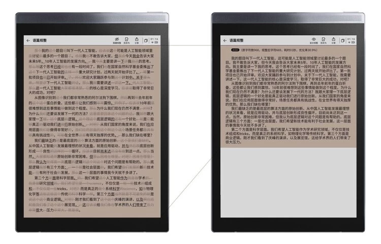 困扰很多公司的另一个问题便是专业词汇的识别,而科大讯飞智能办公本Air也充分考虑了对应问题的解决,根据其语音行业内的多年积累,目前已经提供了16大行业的专业词库,包括了教育、金融、法律、医疗等等,极大地提高了特定对话场景下的专业名词的识别率。近日,科大讯飞智能办公本还搭载星火认知大模型进行了一次功能大升级,其中就包括“语篇规整”和“会议纪要”,不过我个人还是比较喜欢“语篇规整”这个新功能的,能解决我们日常会议、报告或演讲中存在的大量口语化词汇、重复性语句这些问题,去除语音转写文稿中的口语化词汇、过滤冗余词汇,减少语义重复、进行文本顺滑处理,提炼重组语句、对文本进行润色,可以轻松将一篇语音转写文稿规整成书面化内容,从而让整个文稿阅读起来更加顺畅。阅读规整后的文章相比较阅读原文,阅读时间大大降低,阅读效率提高50%以上,工作效率也大大提升。