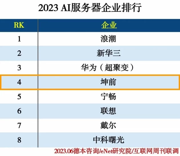 坤前计算机荣登“2023 AI服务器企业排行榜”四强